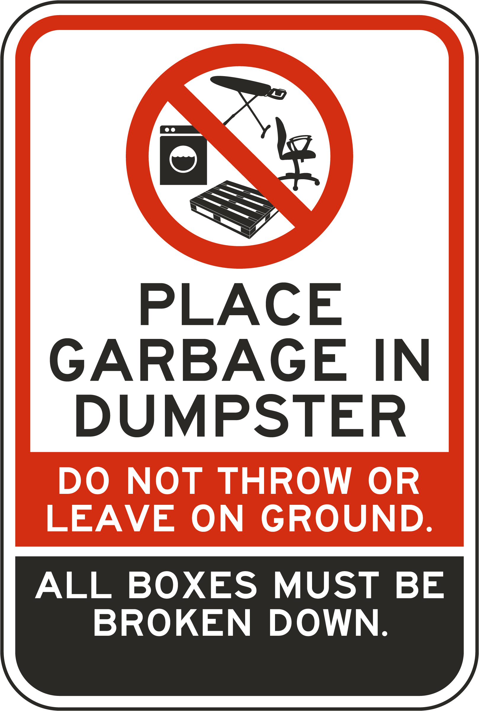 Our Place Garbage In Dumpster Sign clearly directs users to dispose of trash properly, encouraging them to place garbage inside the dumpster. Its durable design withstands outdoor wear and tear, ensuring its effectiveness over time.