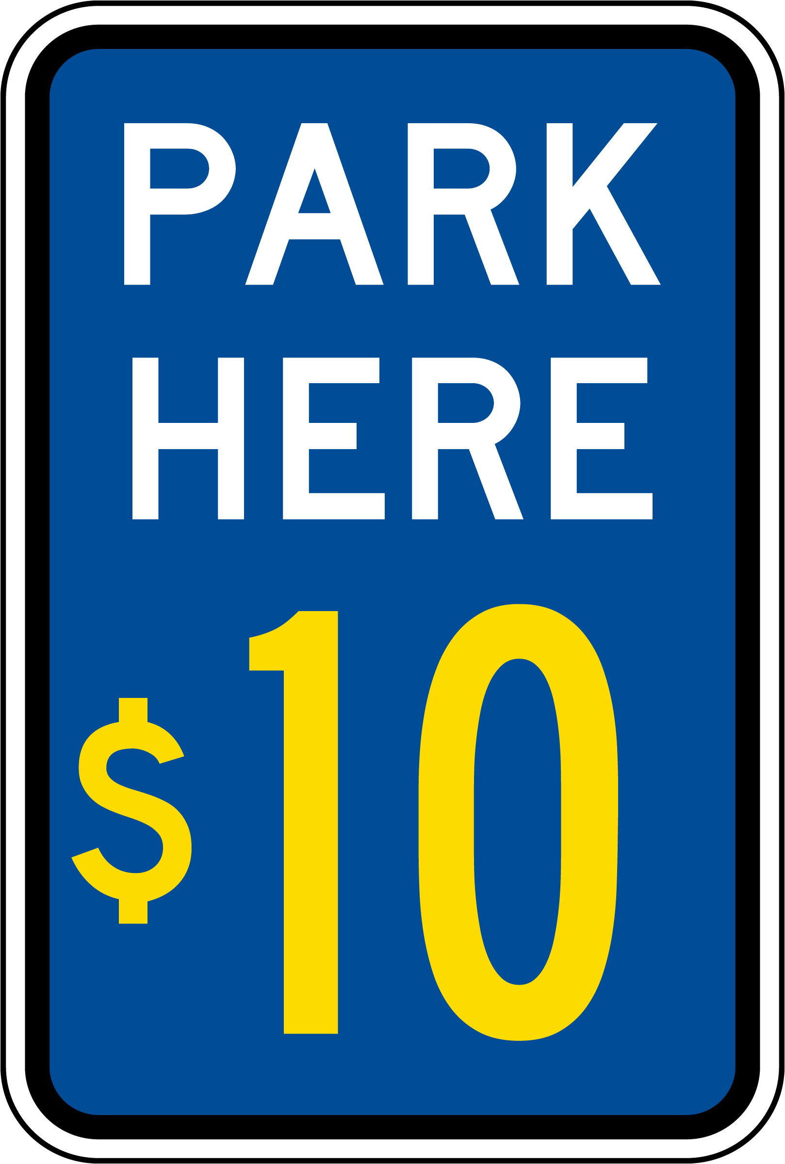 Our Park Here $10 Sign serves as a clear and direct pricing guide for drivers, ensuring they know the parking fee before entering the lot. This sign promotes transparency and helps manage expectations for visitors. Crafted from sturdy, weather-resistant materials, it is built to endure long-term use.