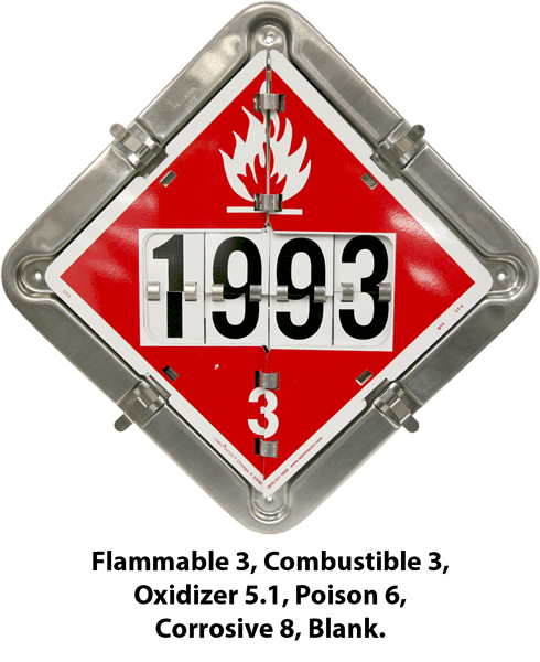 - Provided with the following placards (6): Flammable 3, Combustible 3, Oxidizer 5.1, Poison 6, Corrosive 8 and Blank.